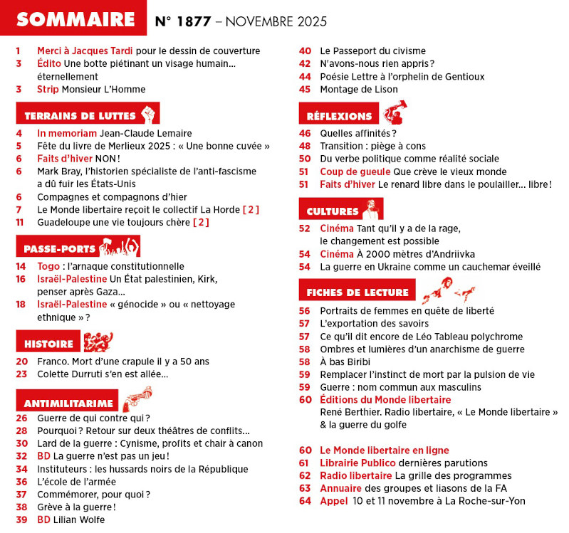 C’est une urgence, pour nous, anarchistes, de rappeler que l’armée est une institution dont le but est de faire s’entre-tuer des travailleurs pour servir des intérêts privés. Il nous faut réaffirmer que c’est le dernier rempart de la bourgeoisie contre les soulèvements sociaux et les aspirations populaires. Que les rêves humides de monde kaki de la bourgeoisie sont à l’opposé de ce que les anarchistes prônent pour l’émancipation des femmes et des hommes, avec au contraire, l’obéissance aveugle pour habitude, la soumission pour éthique et l’aliénation pour cadre de vie.