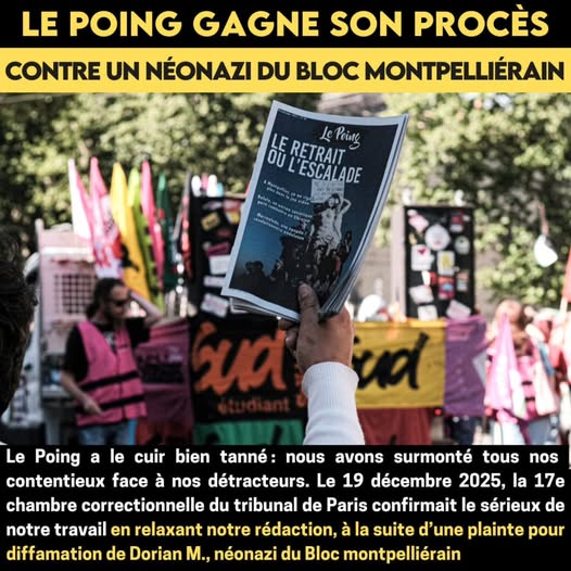 Publié le 17 janvier 2026 à 15:39 (mis à jour le 17 janvier 2026 à 16:03) – https://lepoing.net/le-poing-gagne-son-proces-contre-un-neonazi-du-bloc-montpellierain/